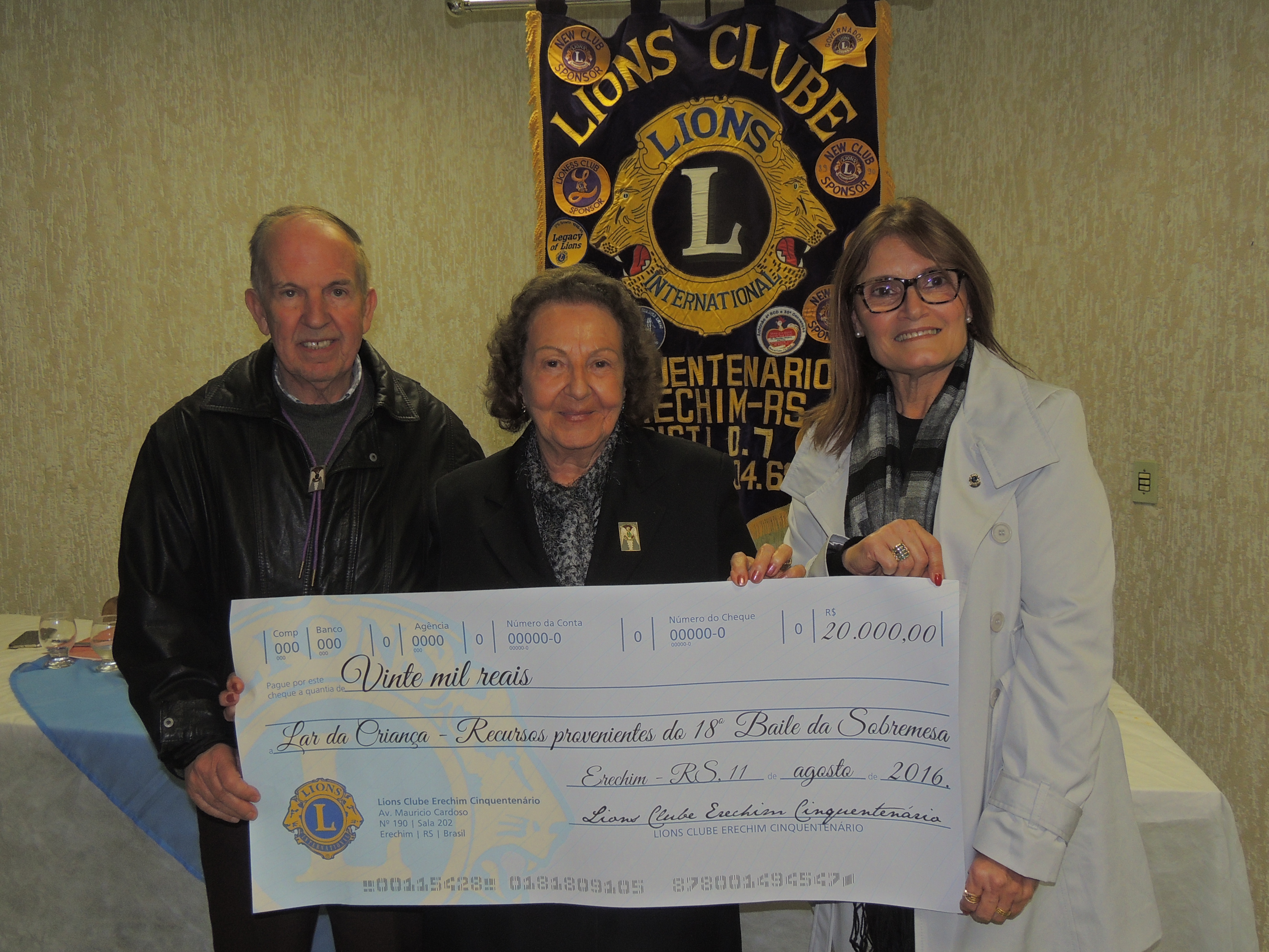O Lions Clube de Erechim cinquentenário, repassou nesta semana para o Lar da Criança de Erechim, um cheque no valor de R$ 20 mi. Este valor se refere ao 18° Baile da Sobremesa que tem como objetivo repassar a renda para entidades da "Capital da Amizade".