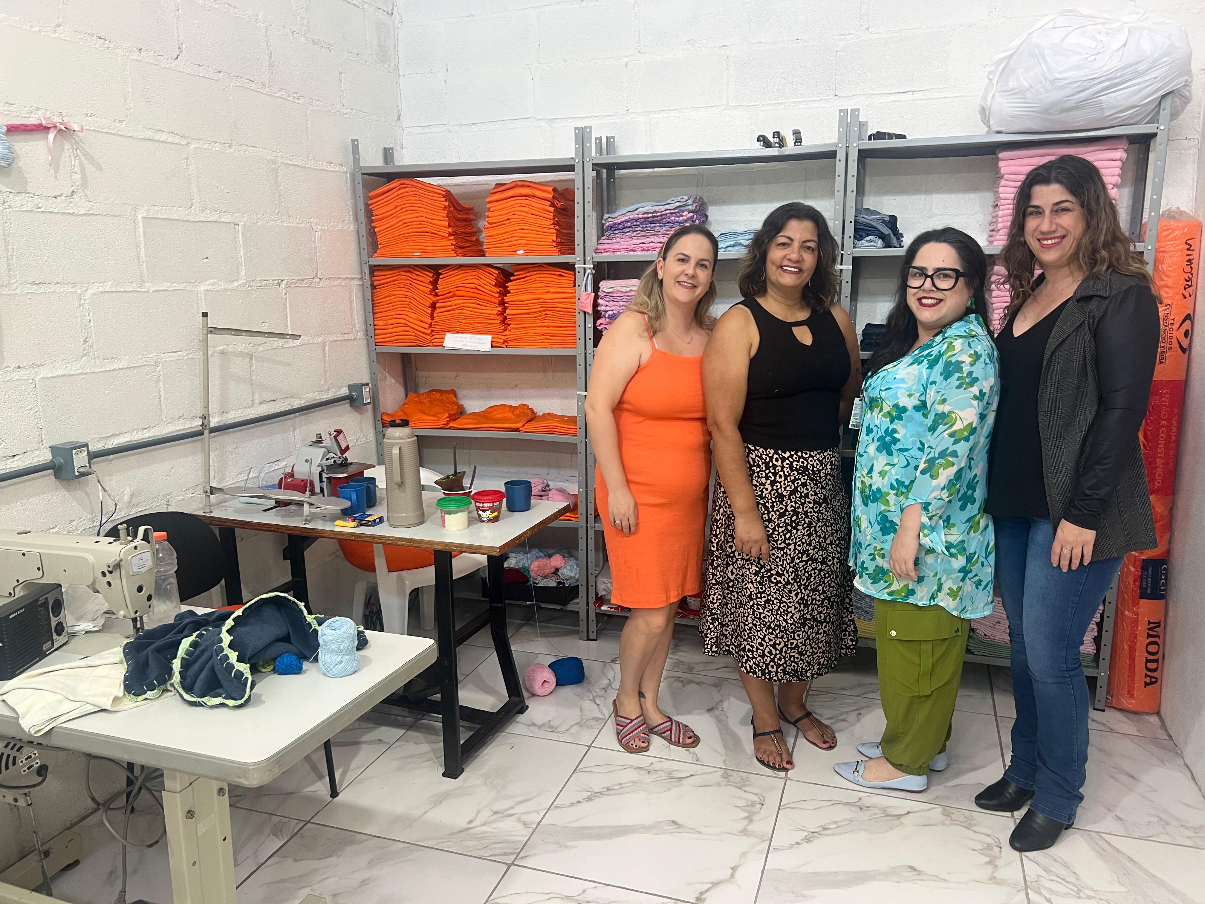 Para marcar a data, desde que teve início essa ação voluntária, estiveram reunidas na Sala de Costura do Presídio Estadual de Erechim na tarde desta quarta-feira (18), a assessora do Gabinete da Primeira-Dama, Carla Alba; a técnica Superior Penitenciário, Ana Cláudia Medeiros; a assistente social, Tavani Barcarolo; a psicóloga Chaiana Mario e as sete apenadas que participam da ação através do trabalho de corte, costura, bordado e crochê.