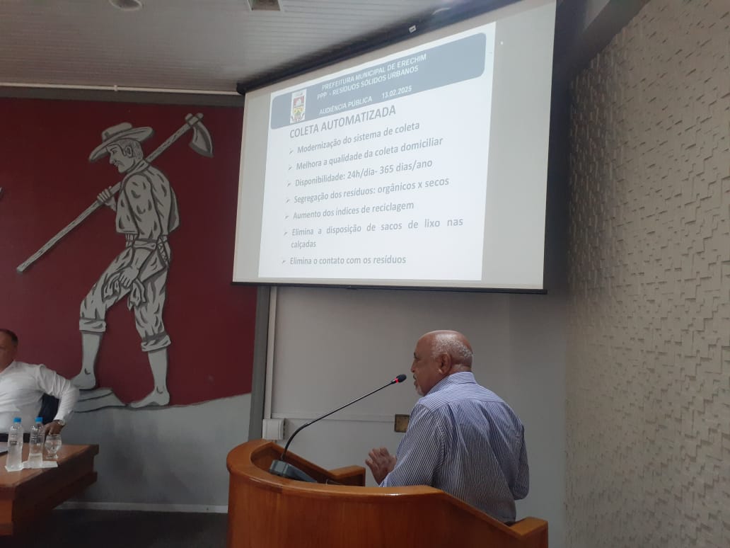 A Prefeitura de Erechim, por meio da Secretaria Municipal de Gestão e Governança, realizou, na Câmara de Vereadores, na manhã desta quinta-feira (13), a Audiência Pública da Modernização, Otimização, Expansão, Operação e Manutenção do Sistema de Resíduos Sólidos Urbanos de Erechim, para apresentar a proposta do novo serviço de recolhimento de lixo do município, que tem como característica principal a automação. Inicialmente, será implantada na área central da cidade e depois vai avançar para os bairros. A proposta prevê investimentos de mais de R$ 155 milhões em 30 anos de concessão.