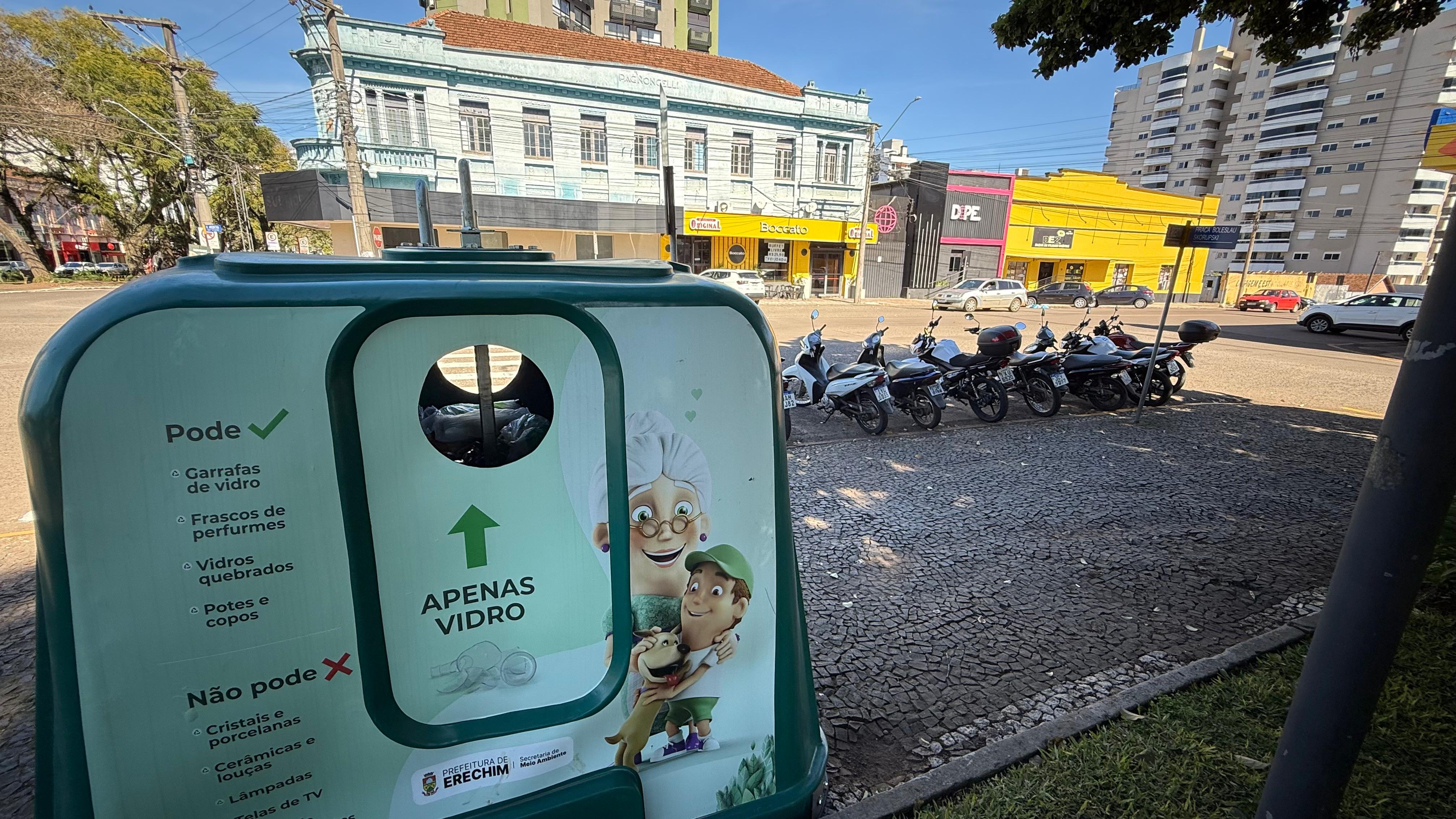A Prefeitura de Erechim, por meio da Secretaria Municipal de Meio Ambiente, instalou contêineres exclusivos para descarte de vidro em pontos estratégicos da cidade. A ação integra o Plano Municipal de Gestão de Resíduos Sólidos e tem como objetivos ampliar a reciclagem, garantir a segurança dos trabalhadores da coleta e fortalecer a conscientização da população sobre a destinação correta.