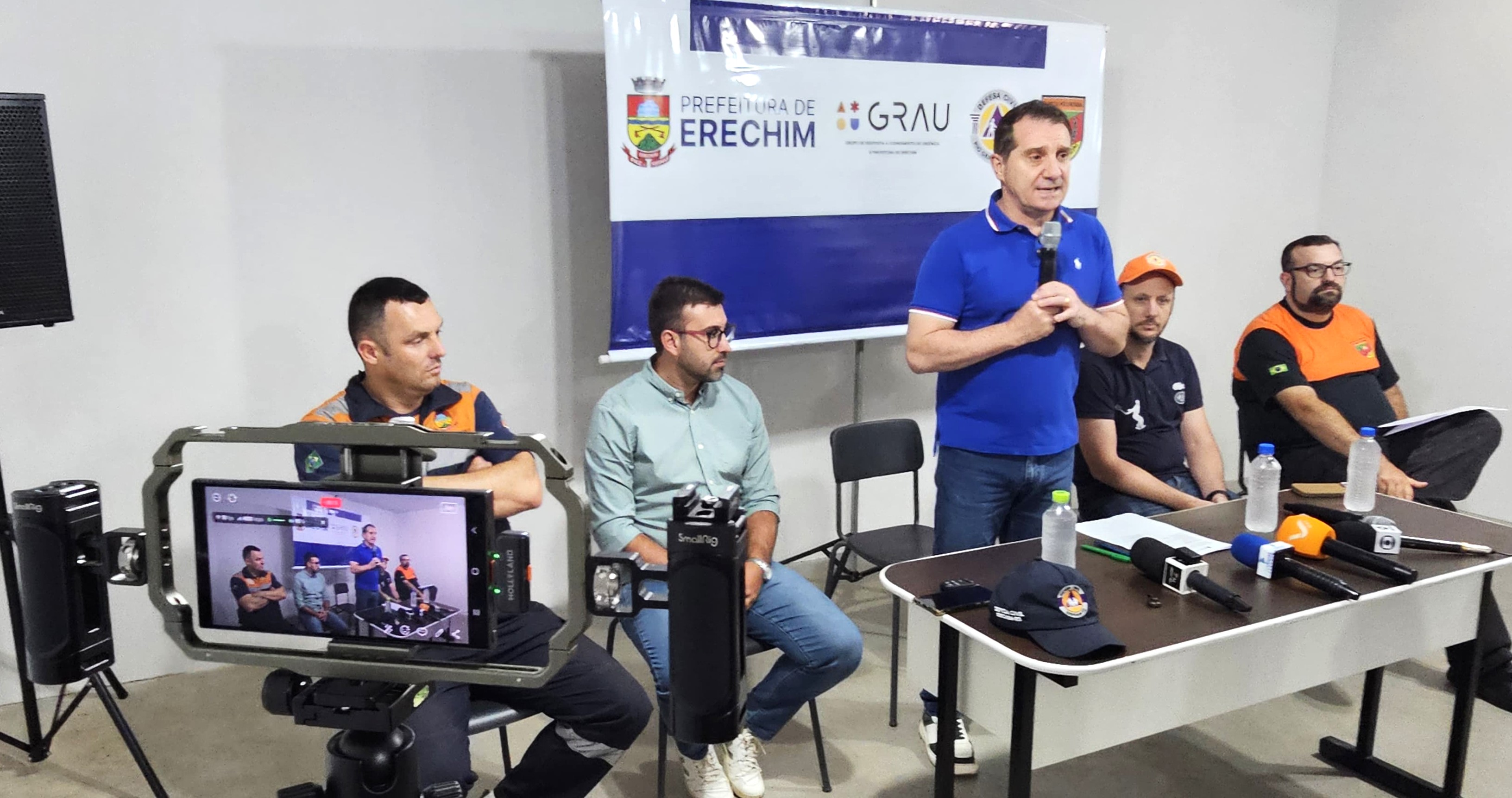 O Comitê de Gerenciamento de Crise para o enfrentamento da Situação de Emergência realizou, na manhã desta quarta-feira (03), uma coletiva de imprensa no GRAU – Grupo de Resposta a Atendimento de Urgência, para apresentar o balanço dos primeiros 10 dias de atuação após a tempestade de granizo que atingiu Erechim no último dia 23 de novembro, e detalhar o planejamento das próximas etapas de trabalho.