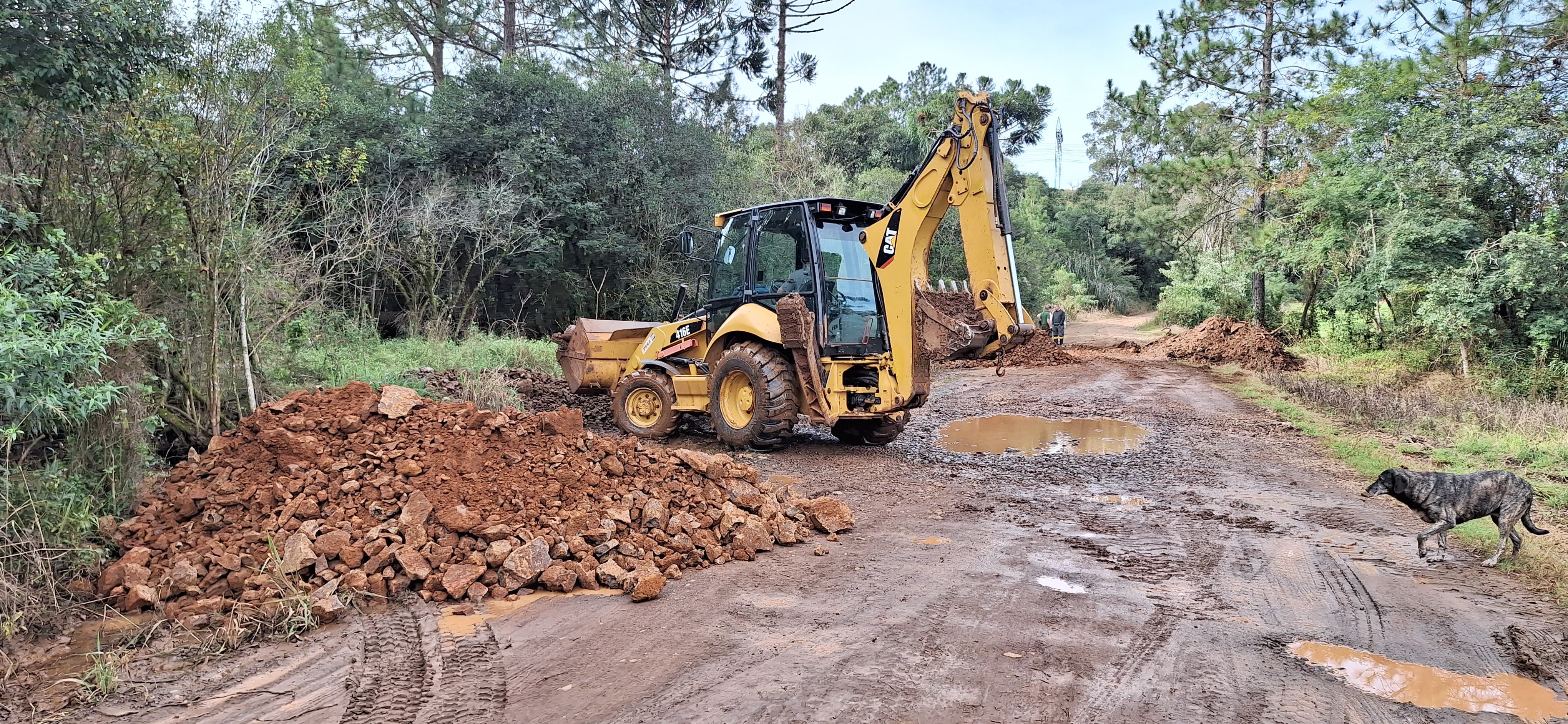 São 7 equipes, 11 caminhões carregando pedra, mais 4 retroescavadeiras e 3 motoniveladoras trabalhando, intensamente, para deixar as estradas em condições de uso para a mobilidade das famílias do campo e o escoamento da produção agrícola
