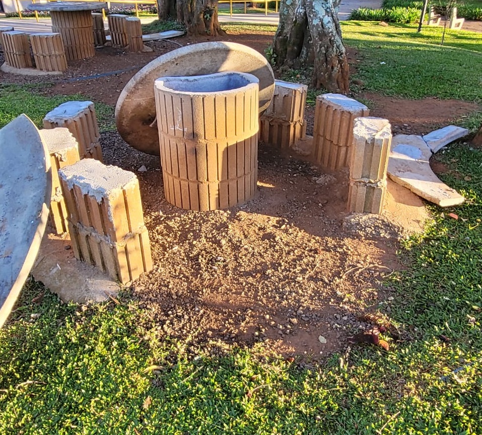 Na ocasião, boa parte dos conjuntos de bancos e mesas foram covardemente arrancados do concreto, além da destruição dos jardins e das flores